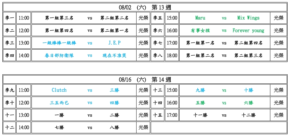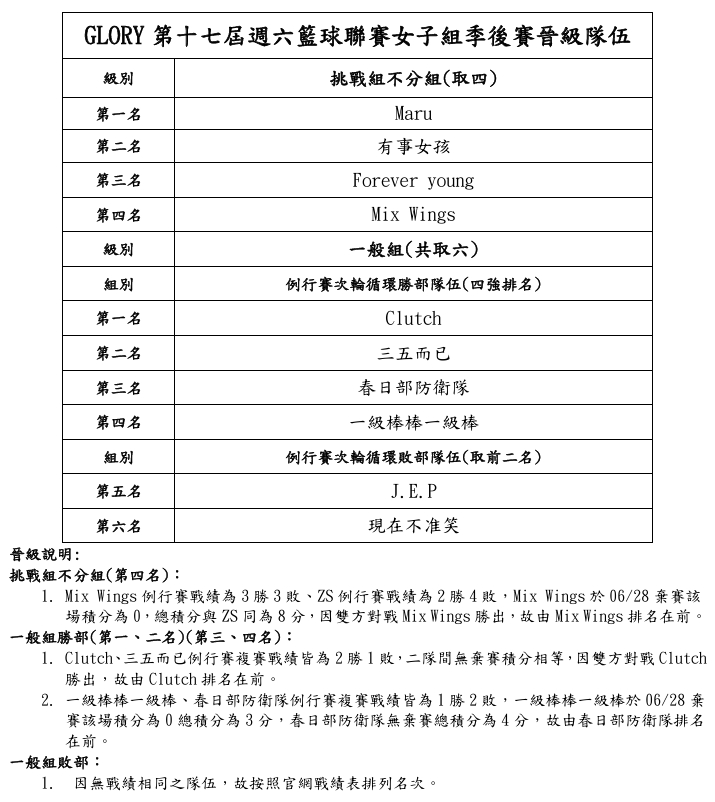 GLORY第十七屆週六籃球聯賽女子組季後賽公告