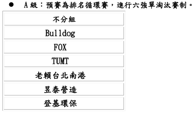 - A級為6隊一組,例行賽5場外加一場季後賽事,總共進行6場賽事。