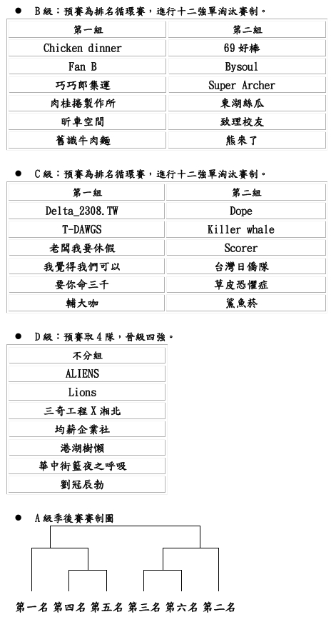 四、分級及分組制度:本屆共招收37隊,分為A、B、C、D四級