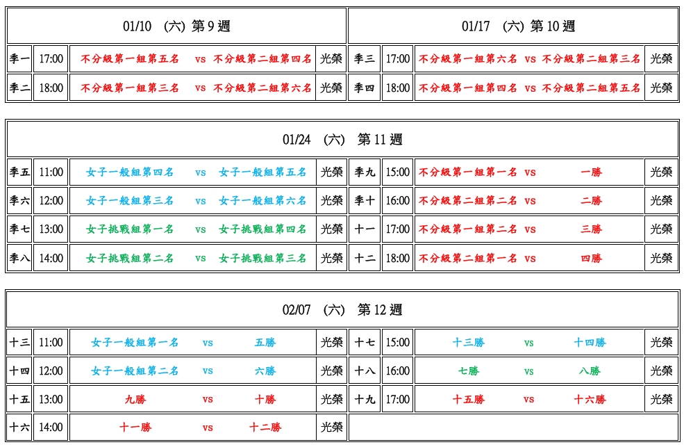 GLORY第十八屆週六籃球聯賽季後賽賽程表